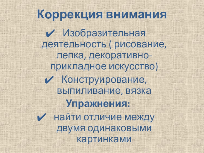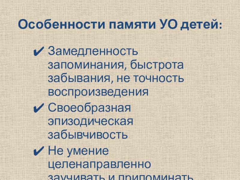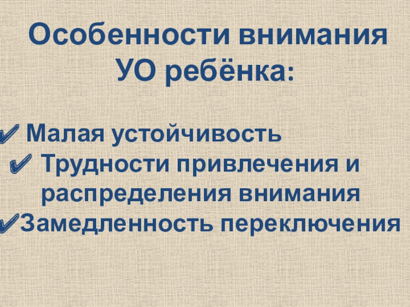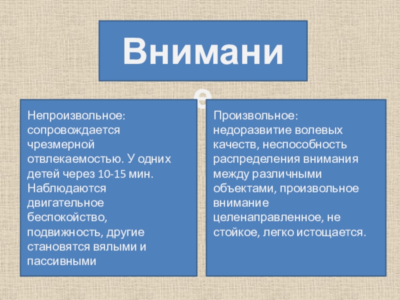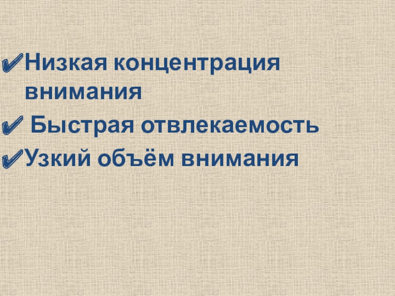 недоразвитие волевых качеств, неспособность распределения внимания между различными объектами, произвольное внимание целенаправленное, не стойкое, легко истощается.