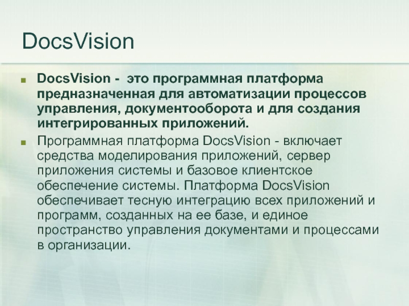Система DocsVision "Делопроизводство" представляет собой законченное приложение, предназначенное для создания архивов документов, автоматизации основных процедур делопроизводства и бизнес процессов обработки документов в организации, включая:
