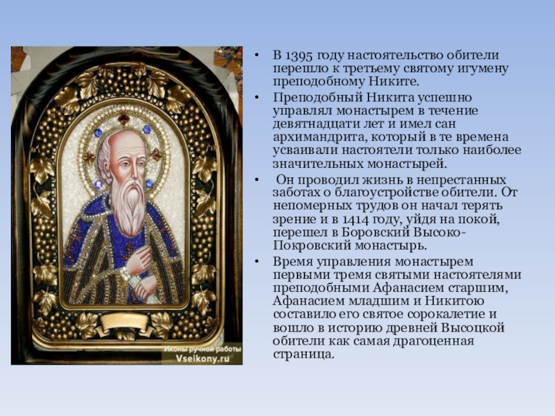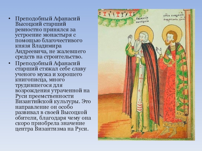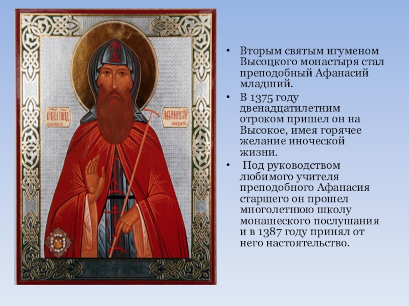 Слайд 10Вторым святым игуменом Высоцкого монастыря стал преподобный Афанасий младший.