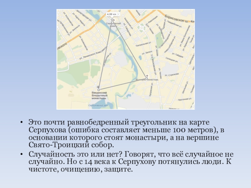 Слайд 3Это почти равнобедренный треугольник на карте Серпухова (ошибка составляет меньше 100