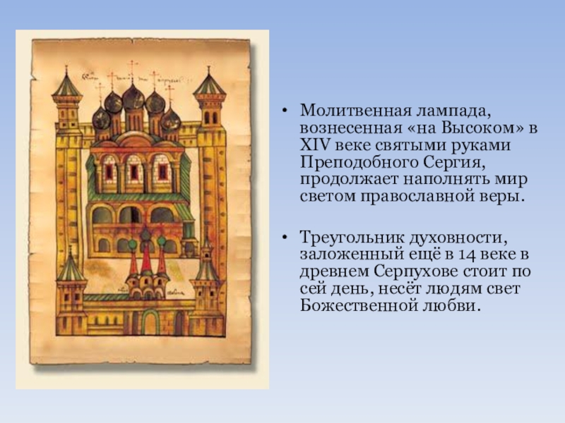 Слайд 15Молитвенная лампада, вознесенная «на Высоком» в XIV веке святыми руками Преподобного