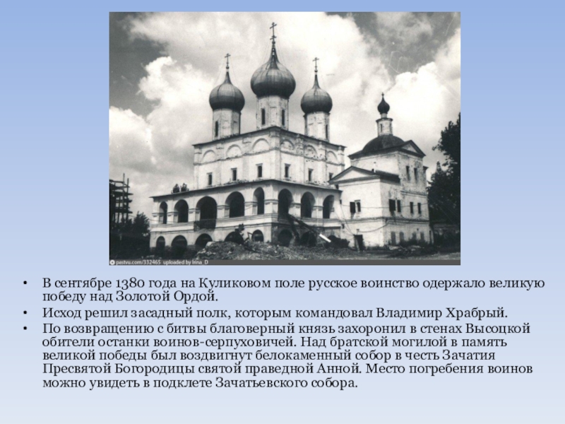 Слайд 6 Основание монастыря связано с именем благочестивого князя Владимира Андреевича (Храброго)