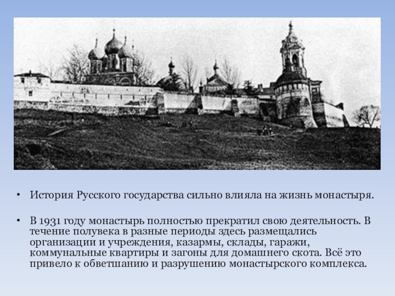 Слайд 13История Русского государства сильно влияла на жизнь монастыря.