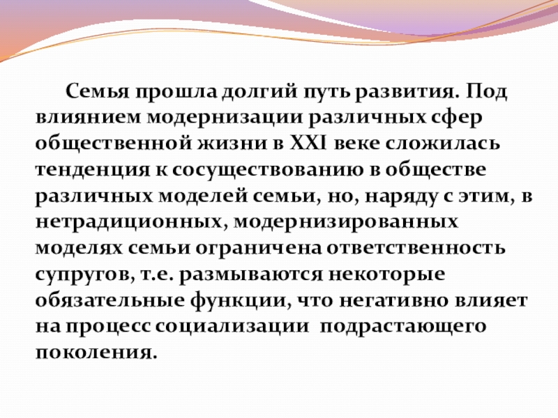 влиянием модернизации различных сфер общественной жизни в XXI веке сложилась тенденция к сосуществованию в обществе различных моделей семьи, но, наряду с этим, в нетрадиционных, модернизированных моделях семьи ограничена ответственность супругов, т.е. размываются некоторые обязательные функции, что негативно влияет на процесс социализации подрастающего поколения.