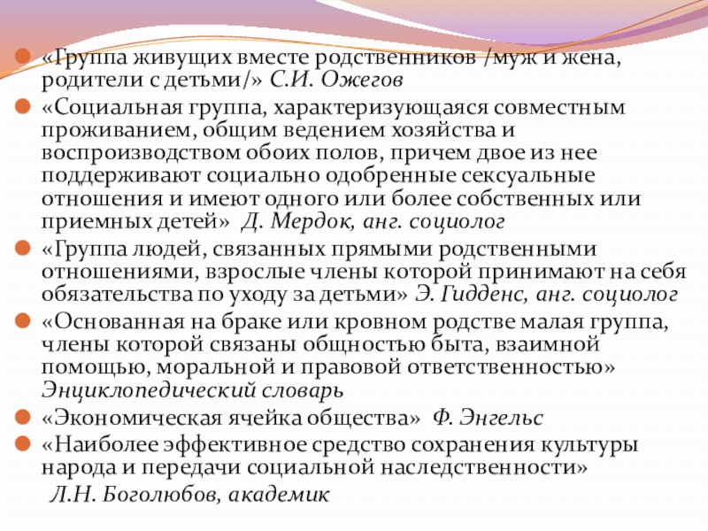 Слайд 4«Группа живущих вместе родственников /муж и жена, родители с детьми/» С.И.