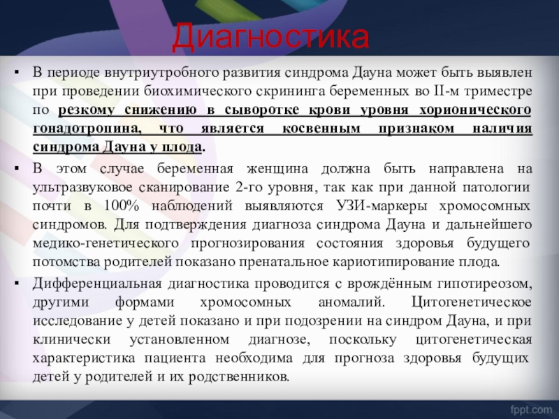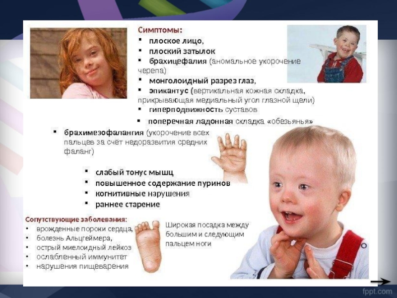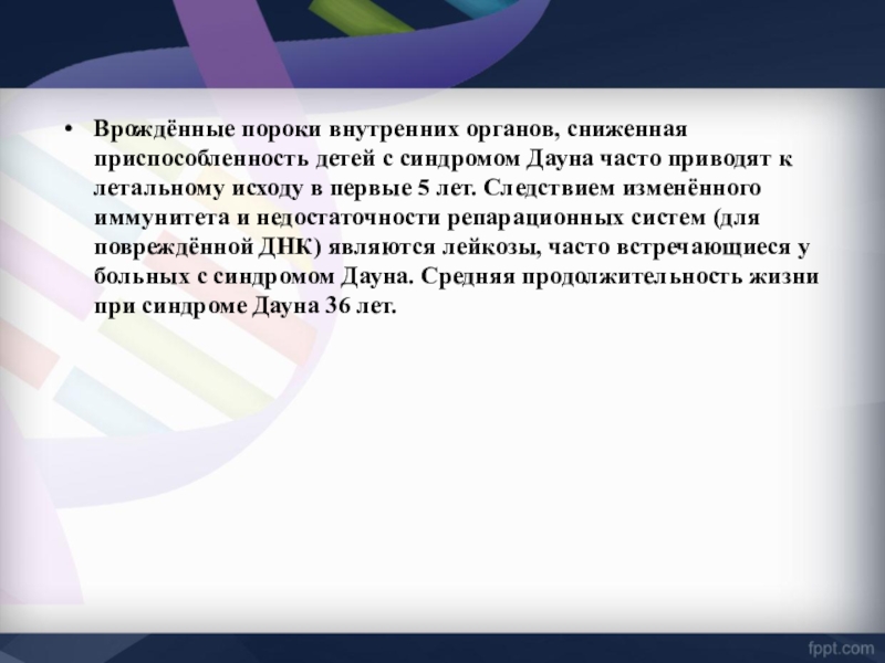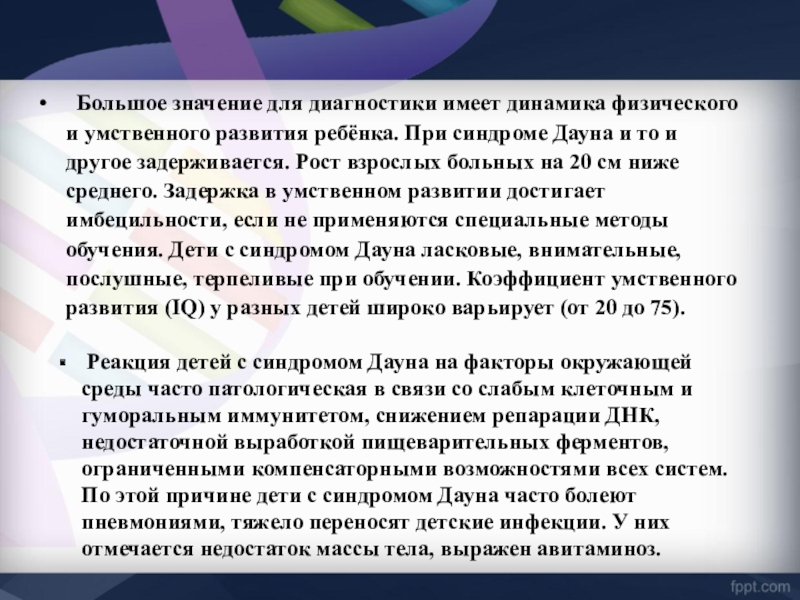 Реакция детей с синдромом Дауна на факторы окружающей среды часто патологическая в связи со слабым клеточным и гуморальным иммунитетом, снижением репарации ДНК, недостаточной выработкой пищеварительных ферментов, ограниченными компенсаторными возможностями всех систем. По этой причине дети с синдромом Дауна часто болеют пневмониями, тяжело переносят детские инфекции. У них отмечается недостаток массы тела, выражен авитаминоз.