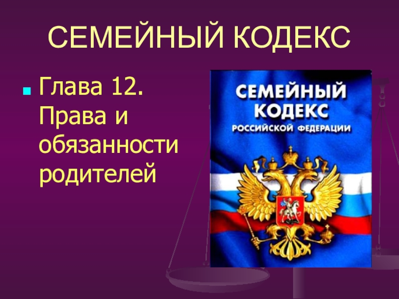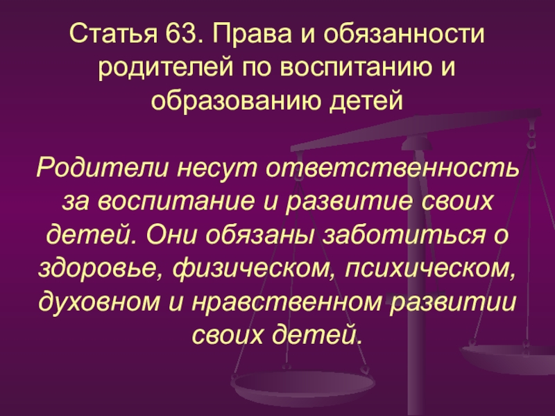 Слайд 12Статья 63. Права и обязанности родителей по воспитанию и образованию детей