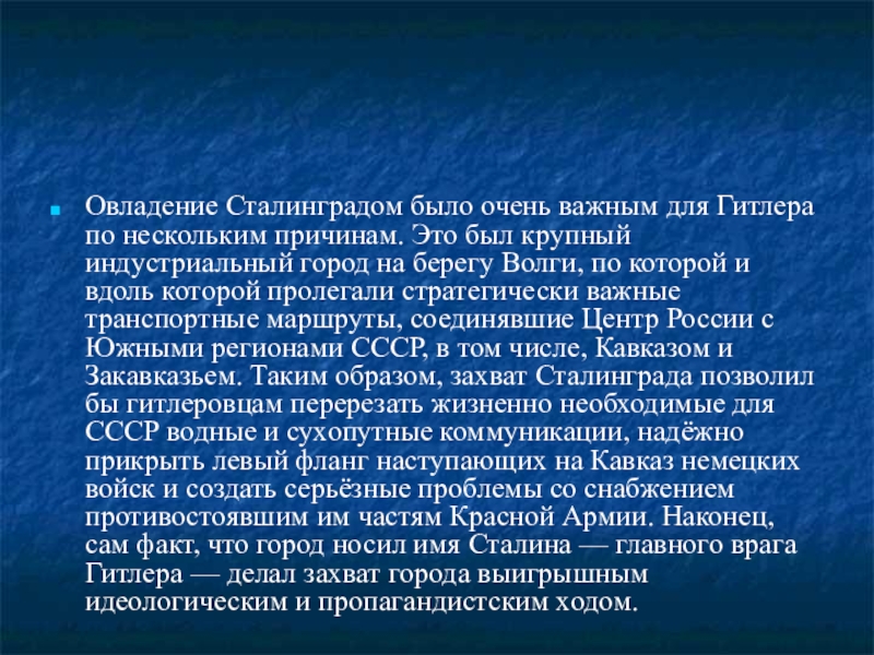 Овладение Сталинградом было очень важным для Гитлера по нескольким причинам. Это