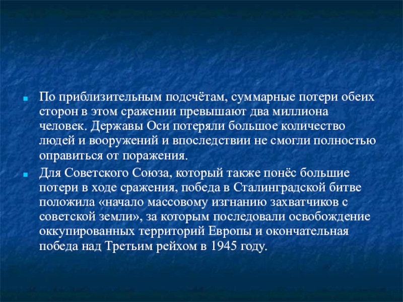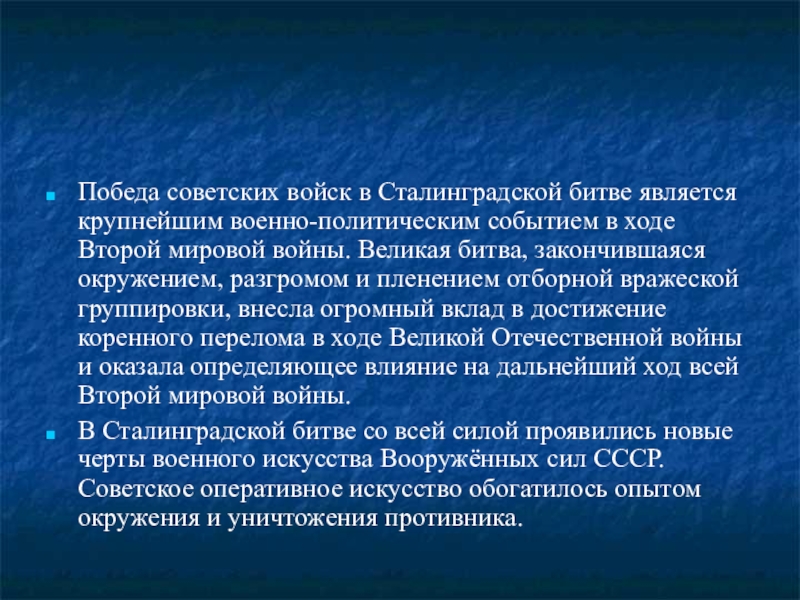 ходе Второй мировой войны. Великая битва, закончившаяся окружением, разгромом и пленением отборной вражеской группировки, внесла огромный вклад в достижение коренного перелома в ходе Великой Отечественной войны и оказала определяющее влияние на дальнейший ход всей Второй мировой войны.