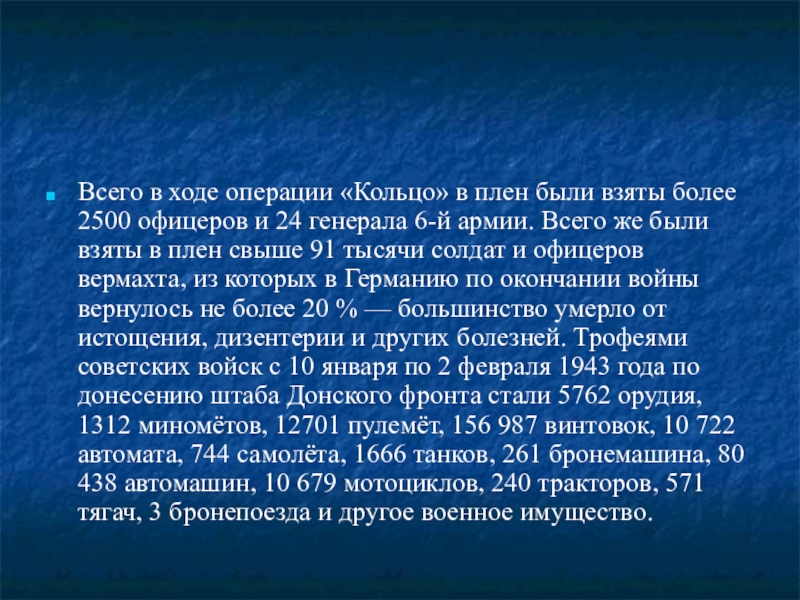 офицеров и 24 генерала 6-й армии. Всего же были взяты в плен свыше 91 тысячи солдат и офицеров вермахта, из которых в Германию по окончании войны вернулось не более 20 % — большинство умерло от истощения, дизентерии и других болезней. Трофеями советских войск с 10 января по 2 февраля 1943 года по донесению штаба Донского фронта стали 5762 орудия, 1312 миномётов, 12701 пулемёт, 156 987 винтовок, 10 722 автомата, 744 самолёта, 1666 танков, 261 бронемашина, 80 438 автомашин, 10 679 мотоциклов, 240 тракторов, 571 тягач, 3 бронепоезда и другое военное имущество.