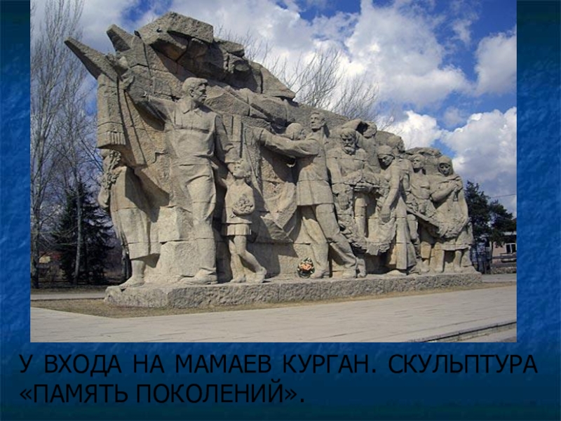 Слайд 21У ВХОДА НА МАМАЕВ КУРГАН. СКУЛЬПТУРА «ПАМЯТЬ ПОКОЛЕНИЙ».