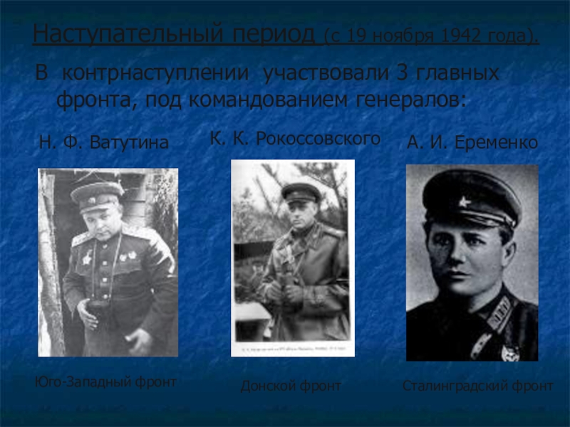 Слайд 11В контрнаступлении участвовали 3 главных фронта, под командованием генералов:
