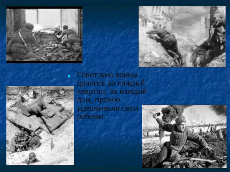 Слайд 10Советские воины дрались за каждый квартал, за каждый дом, прочно удерживали