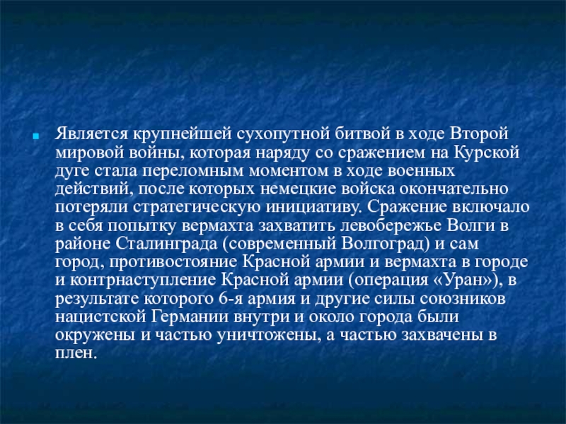 со сражением на Курской дуге стала переломным моментом в ходе военных действий, после которых немецкие войска окончательно потеряли стратегическую инициативу. Сражение включало в себя попытку вермахта захватить левобережье Волги в районе Сталинграда (современный Волгоград) и сам город, противостояние Красной армии и вермахта в городе и контрнаступление Красной армии (операция «Уран»), в результате которого 6-я армия и другие силы союзников нацистской Германии внутри и около города были окружены и частью уничтожены, а частью захвачены в плен.