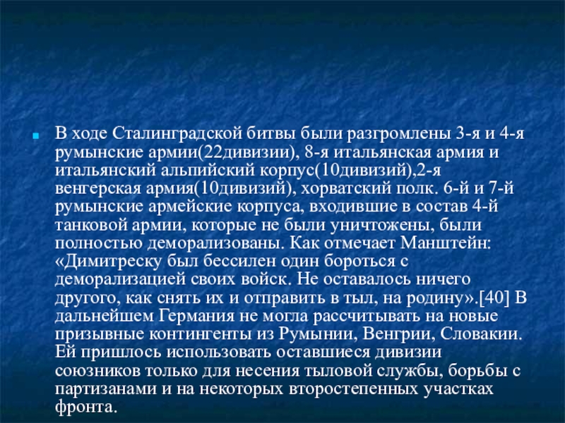 В ходе Сталинградской битвы были разгромлены 3-я и 4-я румынские армии(22дивизии),