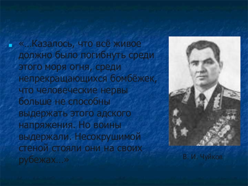 среди непрекращающихся бомбёжек, что человеческие нервы больше не способны выдержать этого адского напряжения. Но воины выдержали. Несокрушимой стеной стояли они на своих рубежах…»