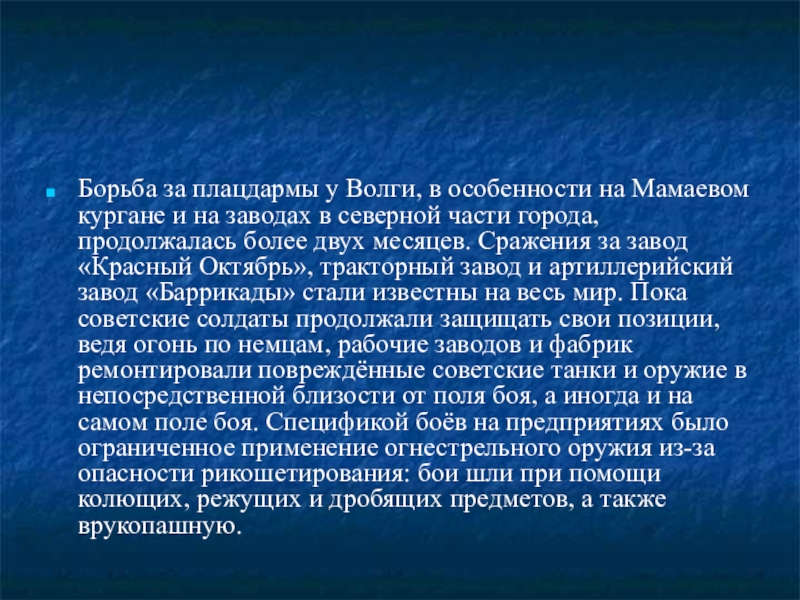 на заводах в северной части города, продолжалась более двух месяцев. Сражения за завод «Красный Октябрь», тракторный завод и артиллерийский завод «Баррикады» стали известны на весь мир. Пока советские солдаты продолжали защищать свои позиции, ведя огонь по немцам, рабочие заводов и фабрик ремонтировали повреждённые советские танки и оружие в непосредственной близости от поля боя, а иногда и на самом поле боя. Спецификой боёв на предприятиях было ограниченное применение огнестрельного оружия из-за опасности рикошетирования: бои шли при помощи колющих, режущих и дробящих предметов, а также врукопашную.