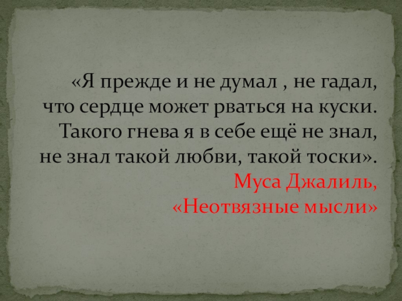 «Я прежде и не думал , не гадал, что сердце может рваться на куски. Такого гнева я в себе ещё не знал, не знал такой любви, такой тоски». Муса Джалиль, «Неотвязные мысли»