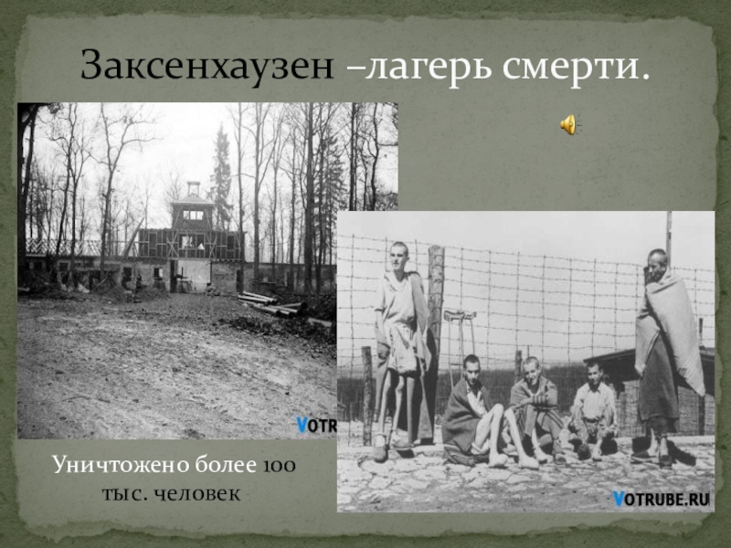 Заксенхаузен –лагерь смерти.Уничтожено более 100 тыс. человек