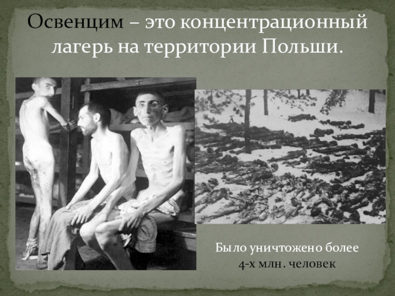 Освенцим – это концентрационный лагерь на территории Польши.Было уничтожено более4-х млн. человек