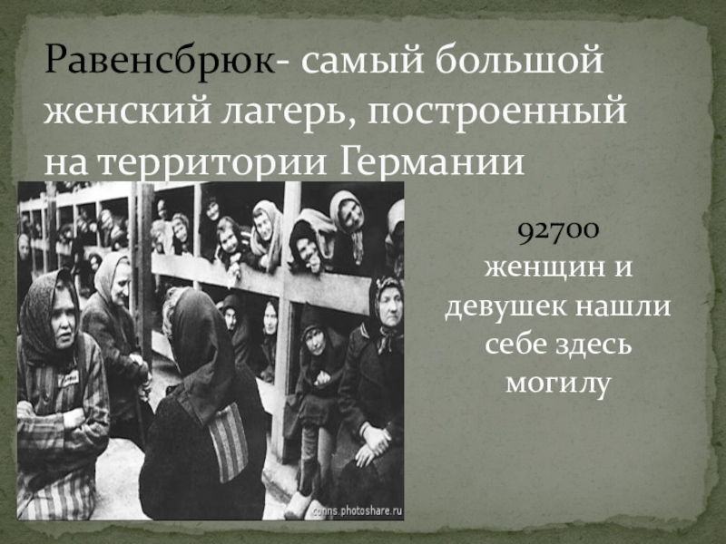Слайд 41Равенсбрюк- самый большой женский лагерь, построенный на территории Германии
