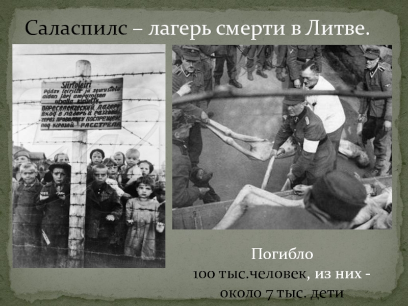 Саласпилс – лагерь смерти в Литве.Погибло100 тыс.человек, из них - около 7 тыс. дети