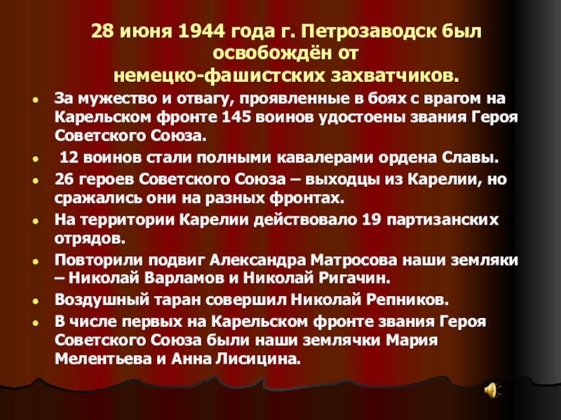 28 июня 1944 года г. Петрозаводск был освобождён от