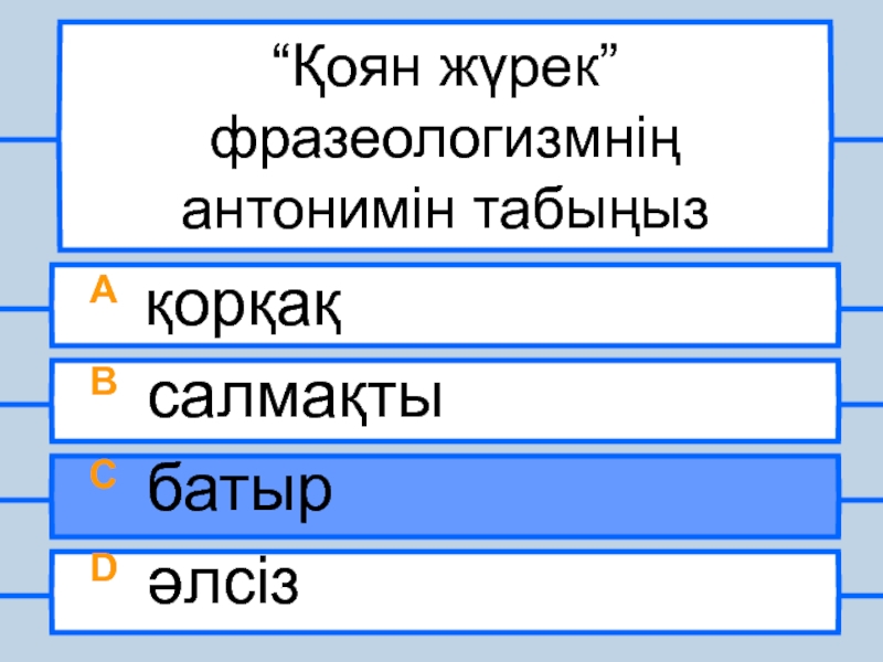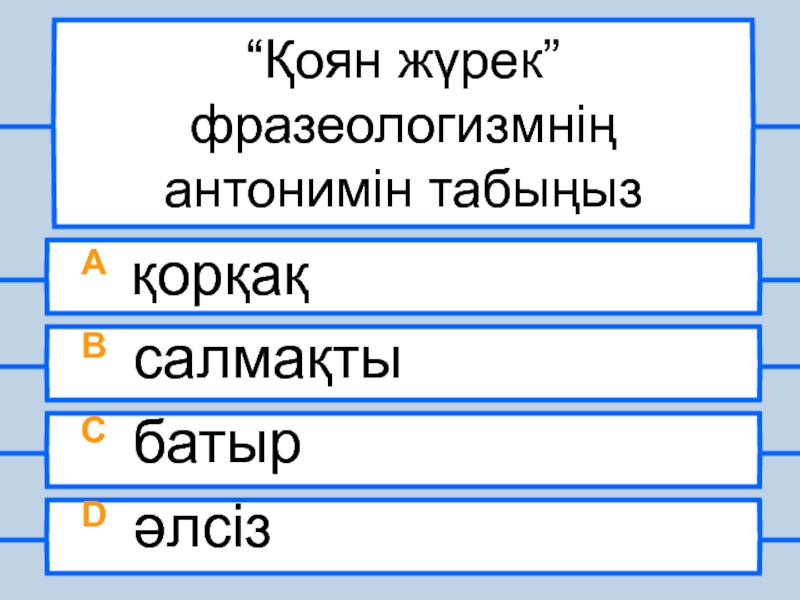 “Қоян жүрек” фразеологизмнің антонимін табыңызA қорқақB салмақтыC батырD әлсіз