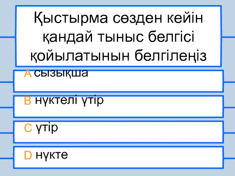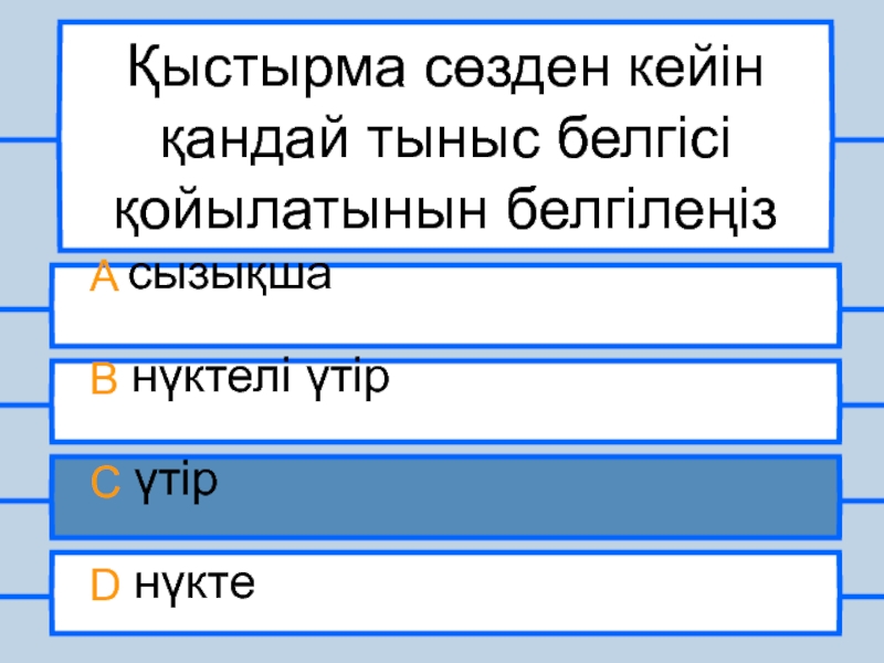 Қыстырма сөзден кейін қандай тыныс белгісі қойылатынын белгілеңізA сызықша B нүктелі үтірC үтірD нүкте