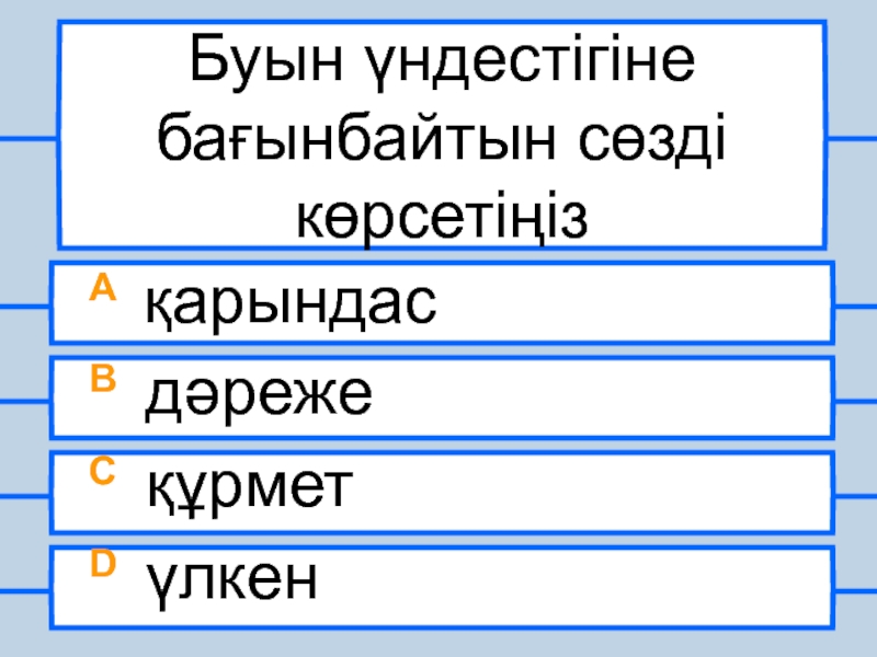 Буын үндестігіне бағынбайтын сөзді көрсетіңізA қарындасB дәрежеC құрметD үлкен