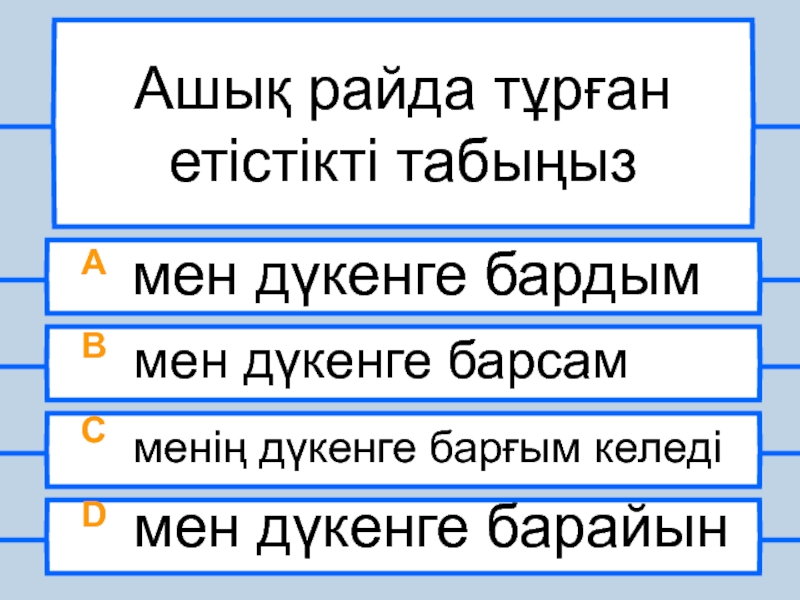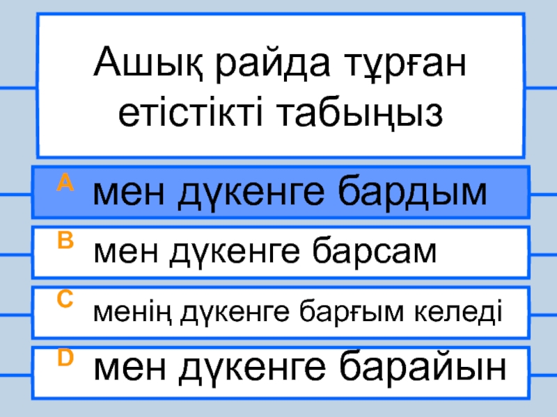 Ашық райда тұрған етістікті табыңызA мен дүкенге бардымB мен дүкенге барсамC менің дүкенге барғым келедіD мен дүкенге
