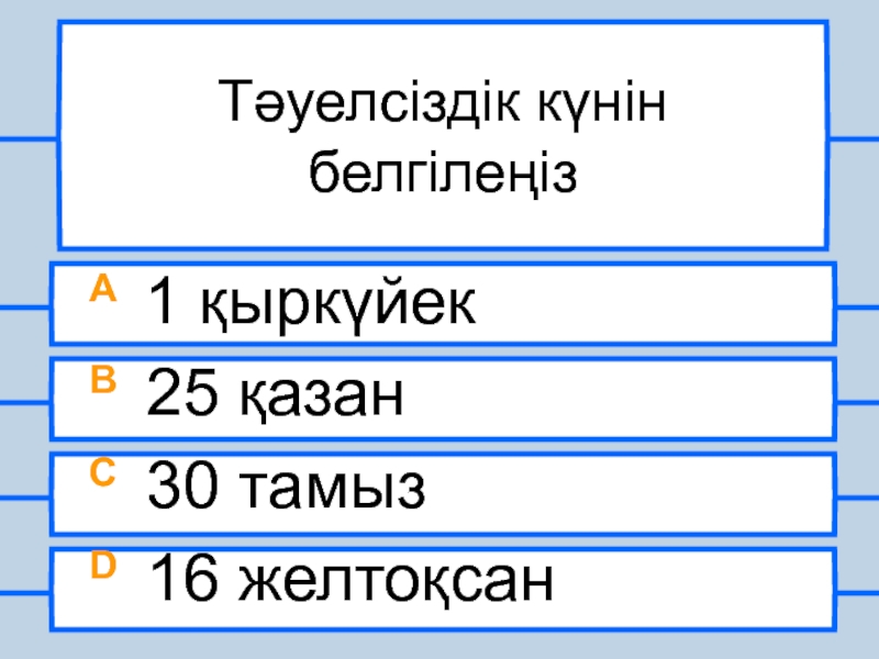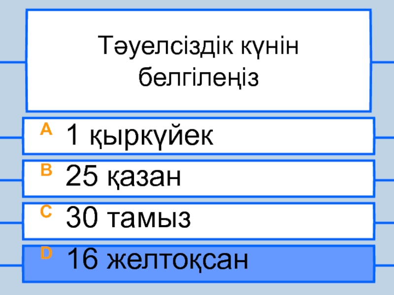 Тәуелсіздік күнін белгілеңізA 1 қыркүйекB 25 қазанC 30 тамызD 16 желтоқсан