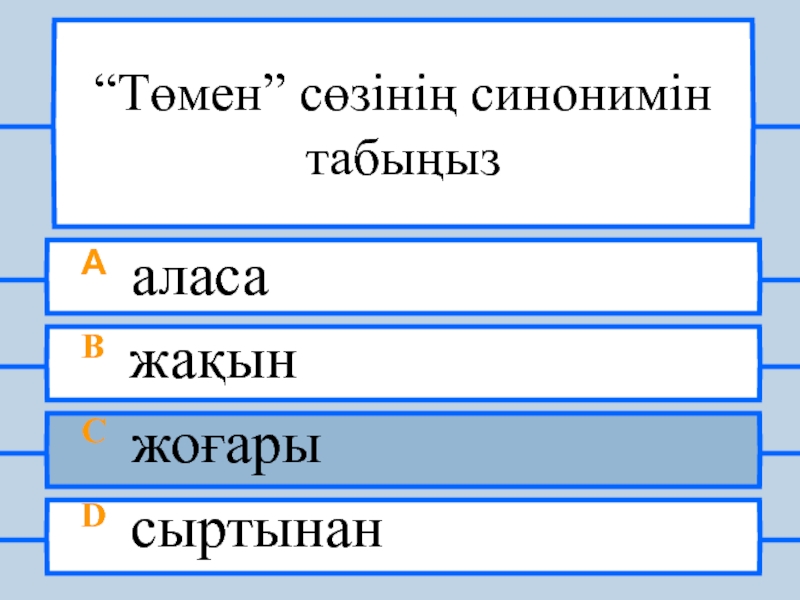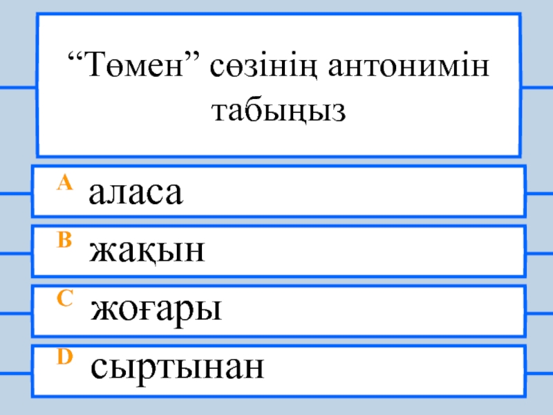 “Төмен” сөзінің антонимін табыңызA аласаB жақынC жоғарыD сыртынан