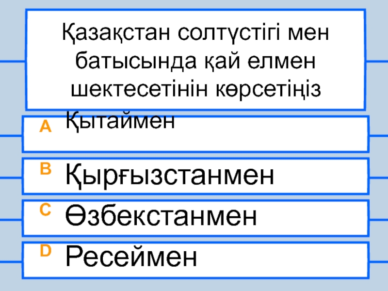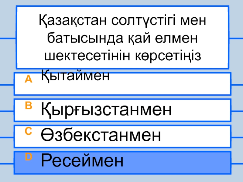 Қазақстан солтүстігі мен батысында қай елмен шектесетінін көрсетіңізA  ҚытайменB ҚырғызстанменC ӨзбекстанменD Ресеймен