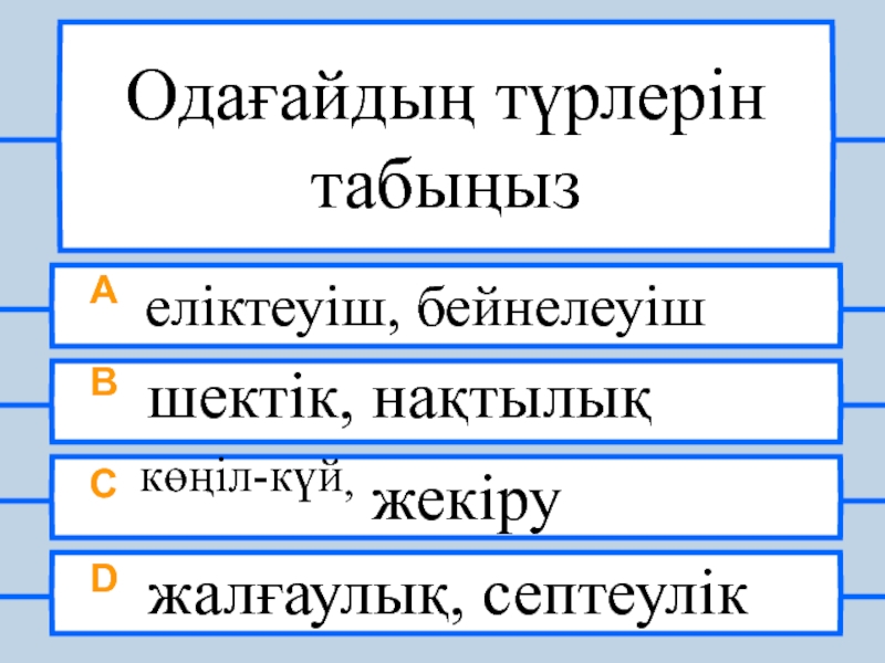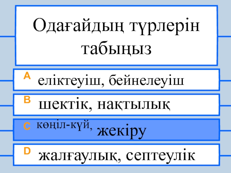 Одағайдың түрлерін табыңызA еліктеуіш, бейнелеуішB шектік, нақтылықC көңіл-күй, жекіруD жалғаулық, септеулік