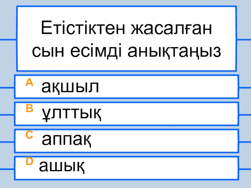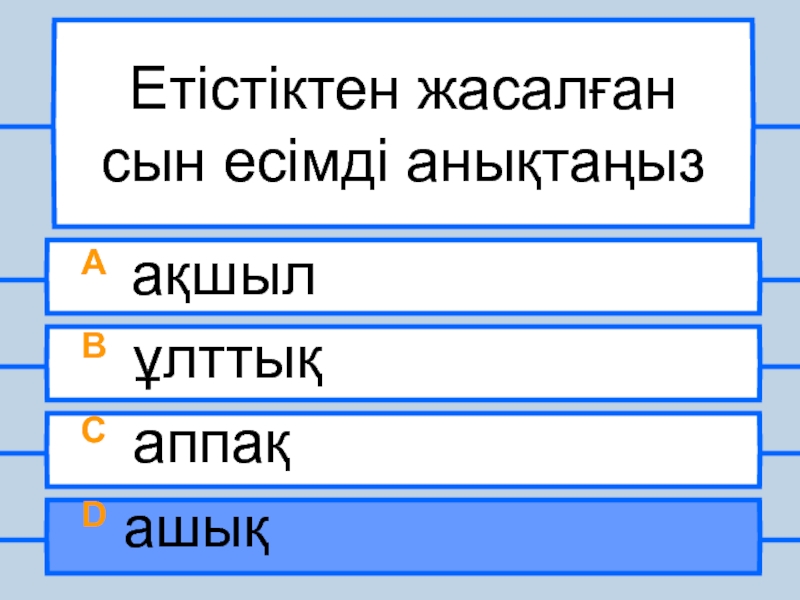 Етістіктен жасалған сын есімді анықтаңызA ақшыл B ұлттықC аппақD ашық
