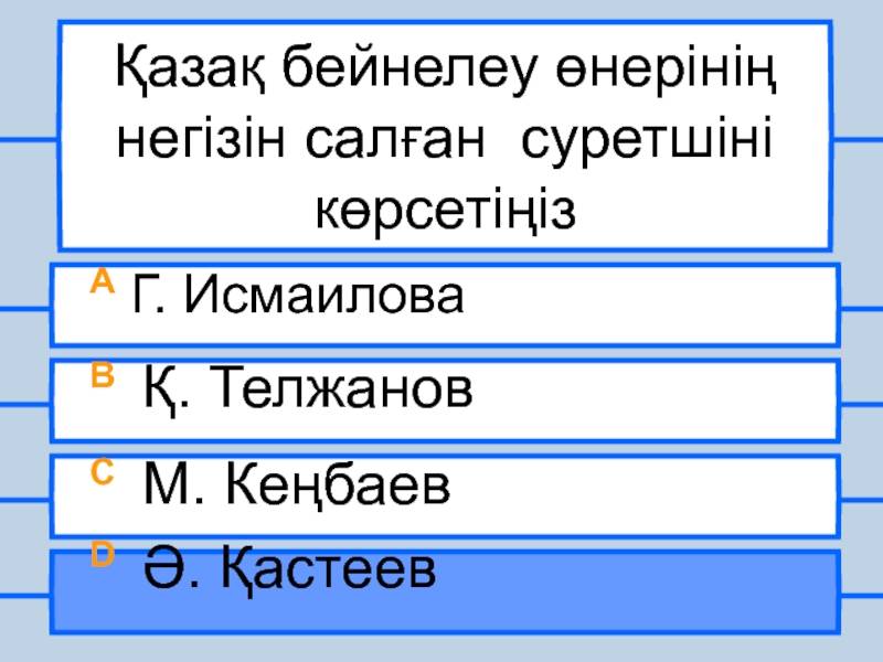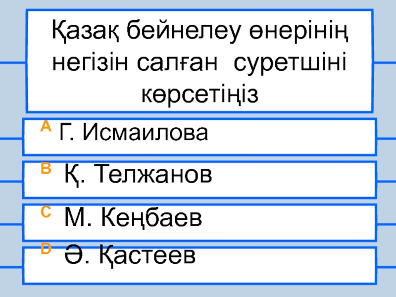 Қазақ бейнелеу өнерінің негізін салған суретшіні көрсетіңізА Г. ИсмаиловаB Қ. ТелжановC М. КеңбаевD Ә. Қастеев