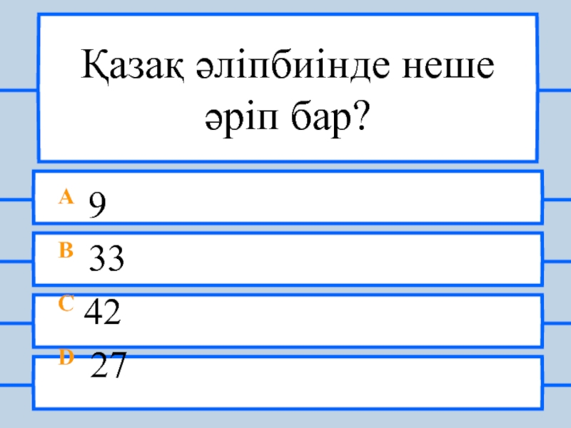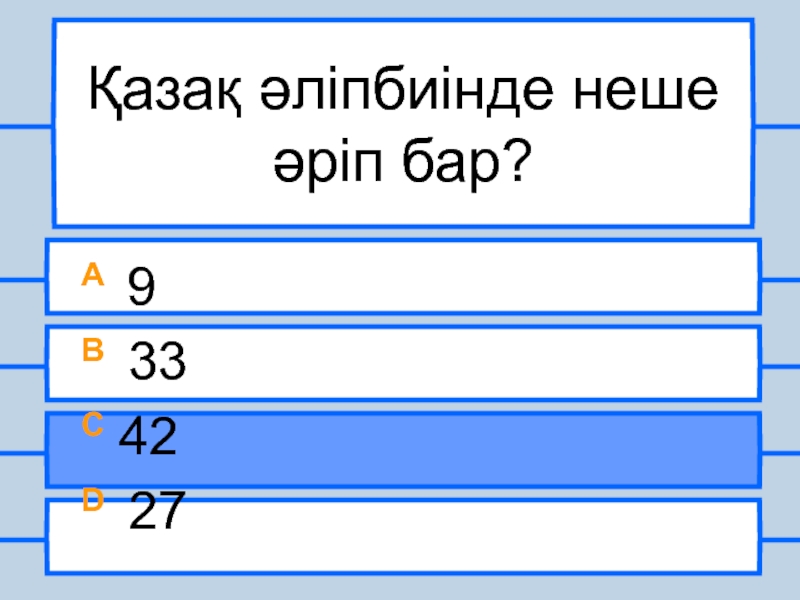 Қазақ әліпбиінде неше әріп бар?A 9B 33C 42D 27