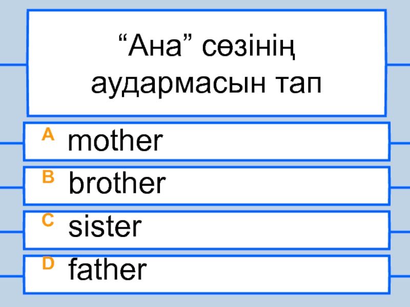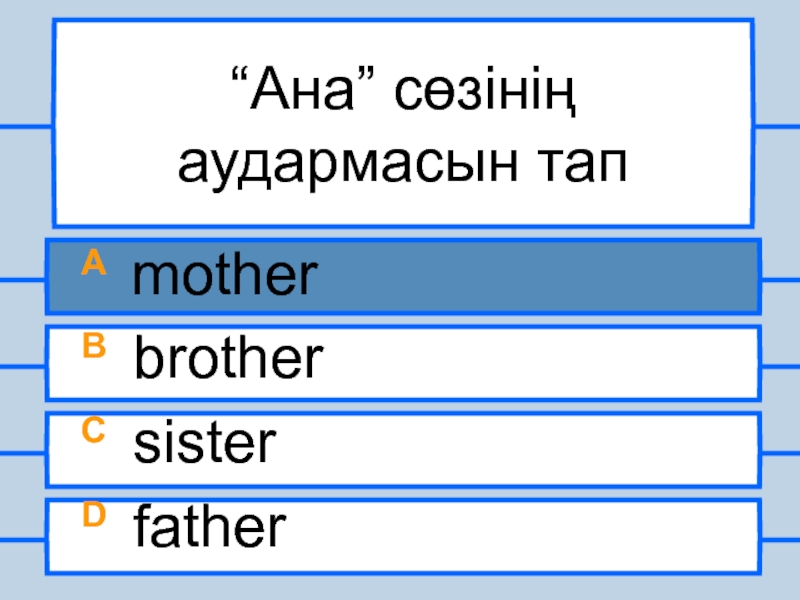 “Ана” сөзінің аудармасын тапA motherB brotherC sisterD father