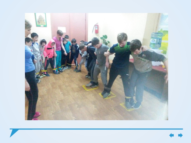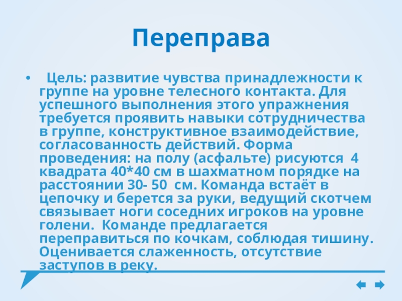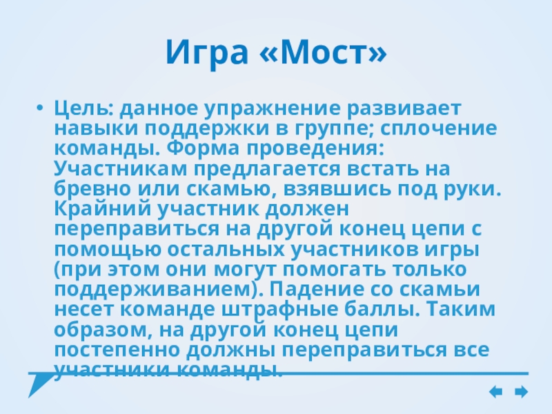 команды. Форма проведения: Участникам предлагается встать на бревно или скамью, взявшись под руки. Крайний участник должен переправиться на другой конец цепи с помощью остальных участников игры (при этом они могут помогать только поддерживанием). Падение со скамьи несет команде штрафные баллы. Таким образом, на другой конец цепи постепенно должны переправиться все участники команды.