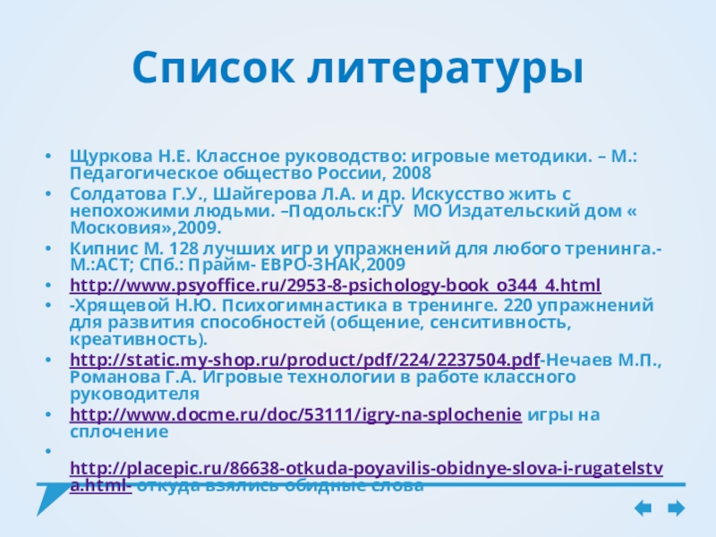Солдатова Г.У., Шайгерова Л.А. и др. Искусство жить с непохожими людьми. –Подольск:ГУ МО Издательский дом « Московия»,2009.