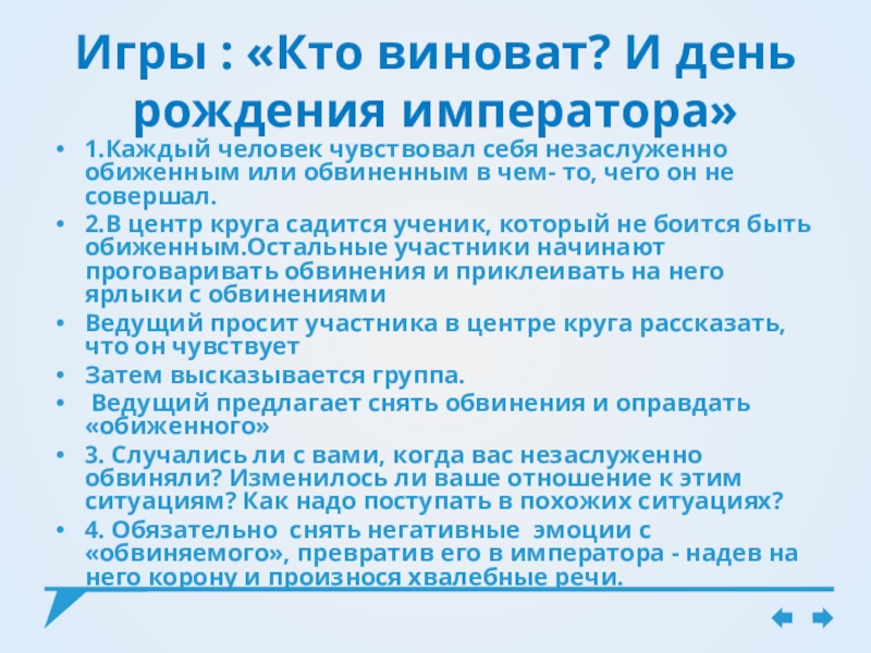 Слайд 13Игры : «Кто виноват? И день рождения императора»