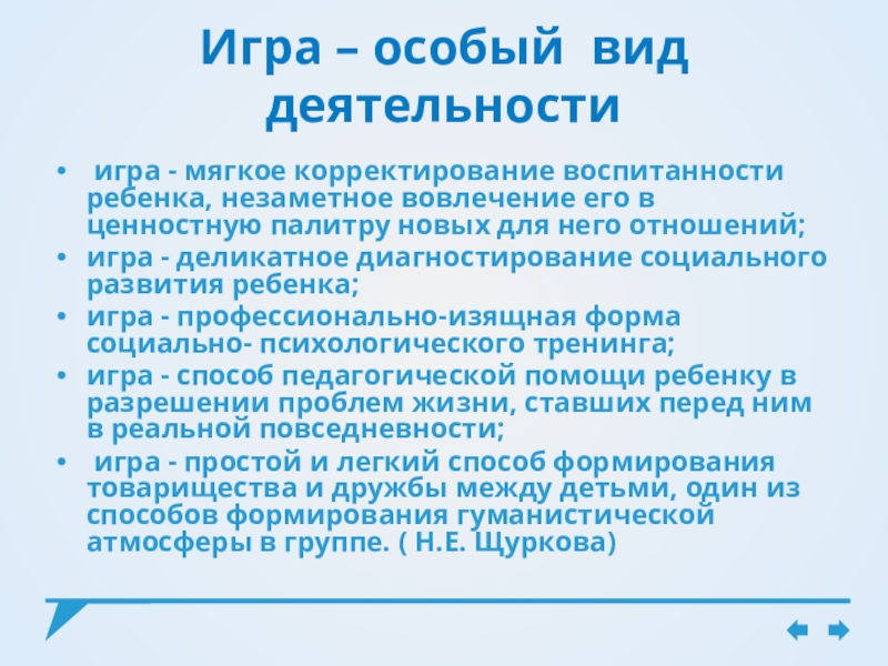 игра - простой и легкий способ формирования товарищества и дружбы между детьми, один из способов формирования гуманистической атмосферы в группе. ( Н.Е. Щуркова)