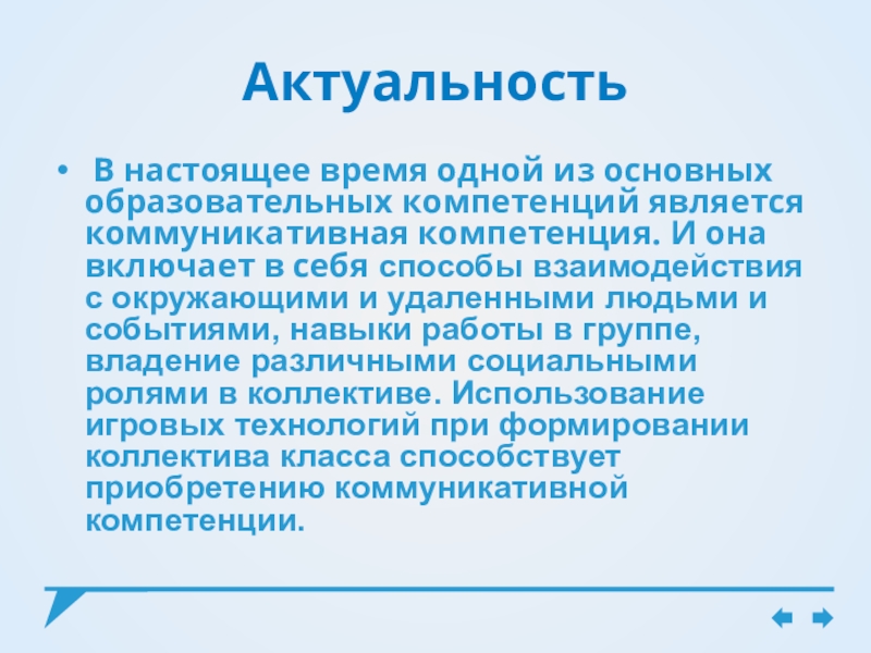 компетенция. И она включает в себя способы взаимодействия с окружающими и удаленными людьми и событиями, навыки работы в группе, владение различными социальными ролями в коллективе. Использование игровых технологий при формировании коллектива класса способствует приобретению коммуникативной компетенции.