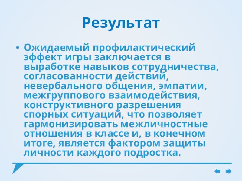 невербального общения, эмпатии, межгруппового взаимодействия, конструктивного разрешения спорных ситуаций, что позволяет гармонизировать межличностные отношения в классе и, в конечном итоге, является фактором защиты личности каждого подростка.