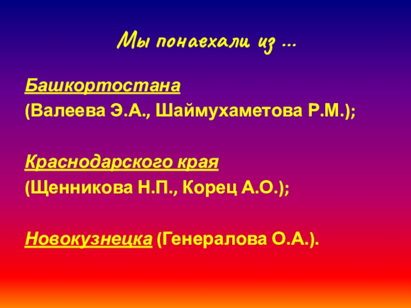 Мы понаехали из …Башкортостана (Валеева Э.А., Шаймухаметова Р.М.);Краснодарского края (Щенникова Н.П., Корец А.О.);Новокузнецка (Генералова О.А.).