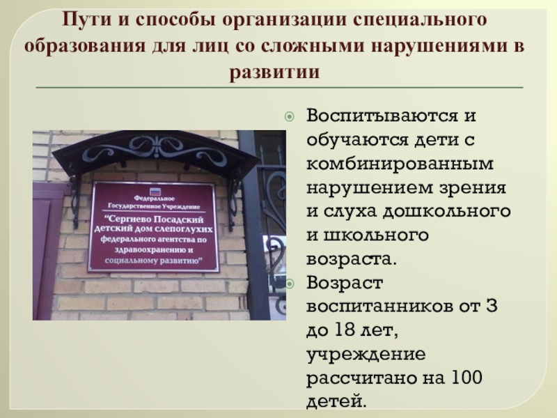 Воспитываются и обучаются дети с комбинированным нарушением зрения и слуха дошкольного и школьного возраста.