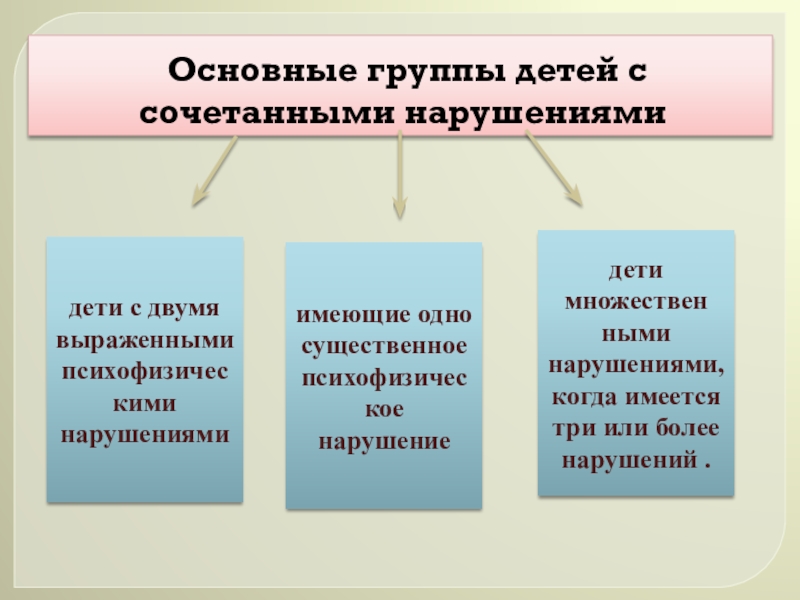 Например, сочетание глухоты и слабовидения, сочетание умственной отсталости и слепоты, сочетание нарушения опорно-двигательного аппарата и нарушений речи.
