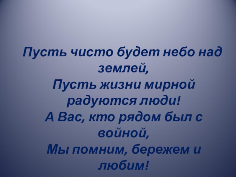 Пусть чисто будет небо над землей,  Пусть жизни мирной радуются люди!  А Вас, кто