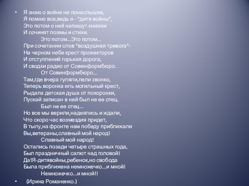 войны", Это потом о ней напишут книжки И сочинят поэмы и стихи.               Это потом...Это потом... При сочетании слов "воздушная тревога"- На черном небе крест прожекторов И отступлений горькая дорога, И сводки радио от Совинформбюро.               От Совинформбюро... Там,где вчера гуляли,пели звонко, Теперь воронка иль могильный крест, Рыдала детская душа от похоронки, Пускай записан в ней был не ее отец.               Был не ее отец... Но все мы верили,надеялись и ждали, Что скоро час возмездия придет, В тылу,на фронте нам победу приближали Вы,ветераны,славный мой народ!               Славный мой народ! Остались позади четыре страшных года, Был праздничный салют над головой! Да!Я-дитявойны,ребенок,но свобода Была приближена немножечко...и мной!                   Немножечко...и мной!!